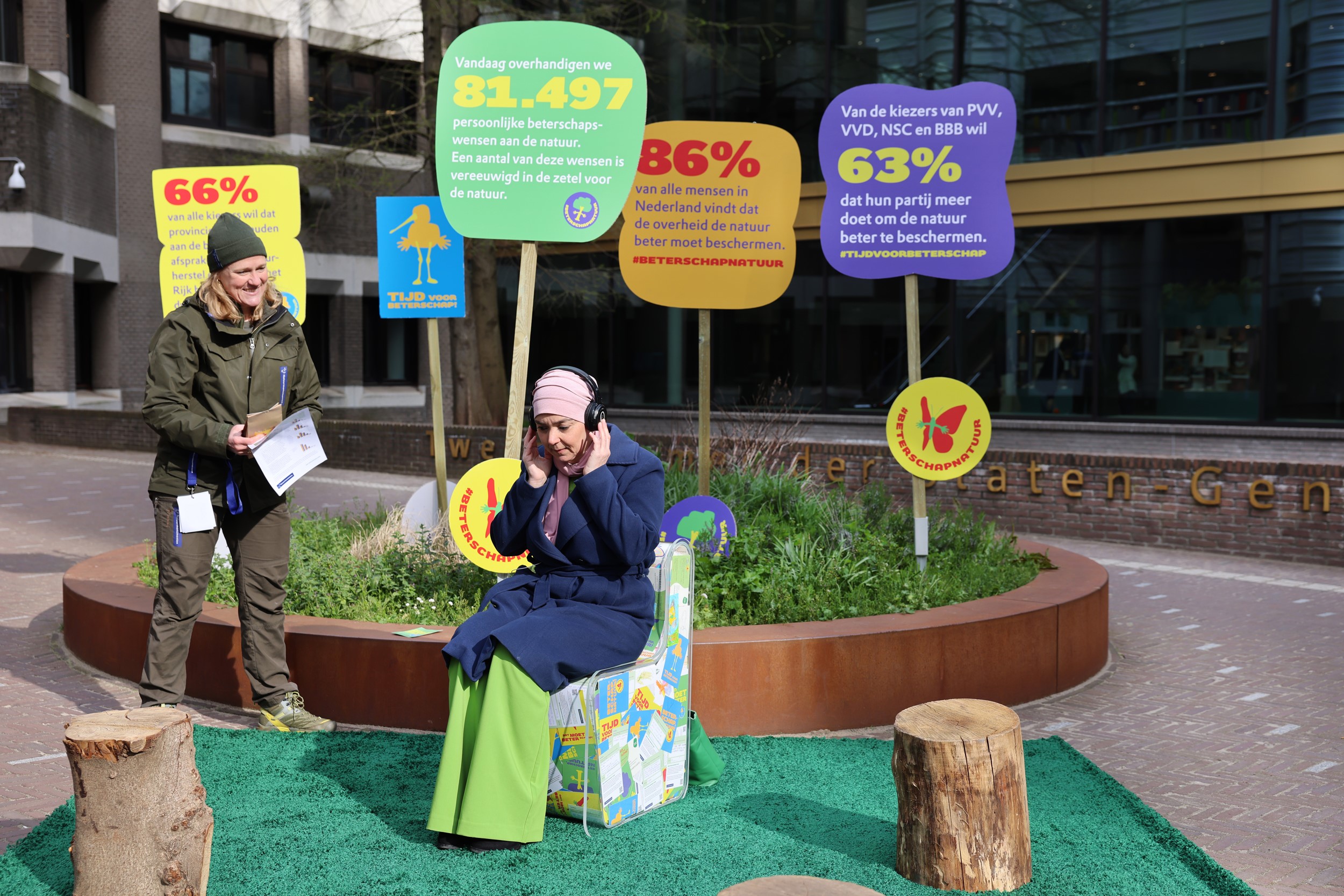 In navolging van de impactvolle Beterschapscampagne en de Boswachtersmars eind vorig jaar in samenwerking met Natuurmonumenten, boden we afgelopen 23 april maar liefst 81.497 beterschapswensen voor de natuur aan in de Tweede Kamer in Den Haag. De boodschap en dringende oproep aan de politiek? Bescherm de Nederlandse natuur beter! Representatief onderzoek toonde dat 86% van de inwoners van Nederland wil dat de overheid de natuur beter beschermt. Dat voor deze oproep veel draagvlak is, bleek uit de massaal ingezonden beterschapswensen voor de natuur.