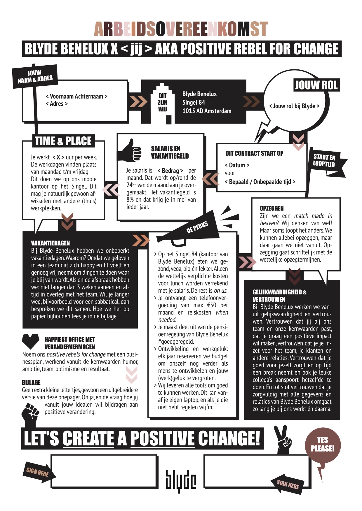 Geïnspireerd door het te gekke contract van onze B-Corp collega Tony’s Chocolonely heeft ook Blyde haar arbeidsovereenkomst aangepast. Niet eindeloos veel paragrafen en onbegrijpelijke teksten, maar een document dat past bij onze kernwaarden en waar je energie van krijgt! Zo stellen wij impact voorop in alles wat we doen.